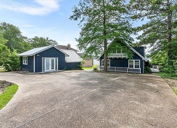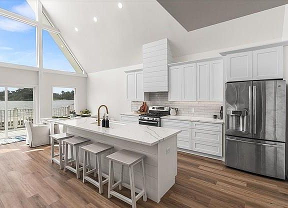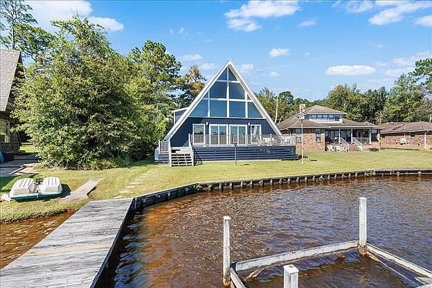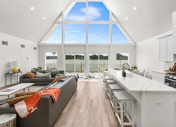 Water front viewWood deckDetached garageOpen spaceSoaring cathedral ceilingsGlass windows