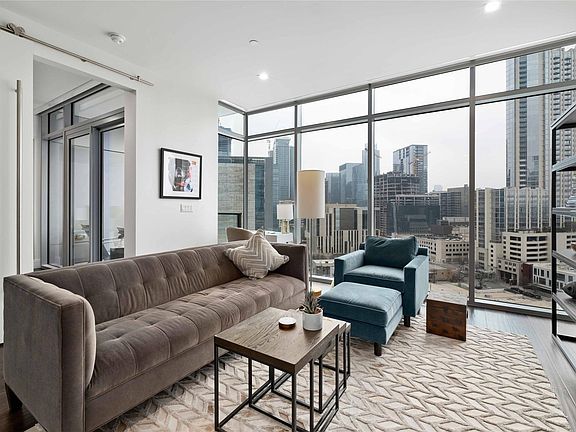 Welcome home to a luxury, light-filled space above Downtown Austin’s Market District at Fifth & West Residences. With southeastern views overlooking Austin’s dynamic cityscape, you can enjoy the natural beauty of Austin while living in the center of it all. The thoughtfully designed kitchen includes flat-front, Italkraft cabinetry, stainless-steel Miele appliances, quartz-topped island with a waterfall edge and breakfast bar seating. The luxurious appliance package includes double ovens, a built-in wine refrigerator, 5-burner gas cooktop and 36" counter depth refrigerator. The owner’s suite is an escape from your busy life and comes complete with blackout shades and an oversized walk-in closet with custom Italian built ins. The marble-clad floors and floating vanity play off the frameless glass shower in your serene full bathroom, which features a pocket door separating the water closet and third vanity, creating the feeling of an additional half bath. Step out onto your private terrace for fresh air and sunset views overlooking Austin. Walls of glass and 9 ft+ ceilings make this 1-bedroom/1.25-bathroom residence feel even more spacious. Dedicated storage, parking for one compact car, keyless entry, and smart home automation complete the picture. Fifth & West reframes the art of living downtown with striking residences, effortless ownership, and a perfect downtown location. Tax and assessed values are estimates for illustration purposes only. All figures should be independently verified. Call or text listing agent to schedule a private showing.
