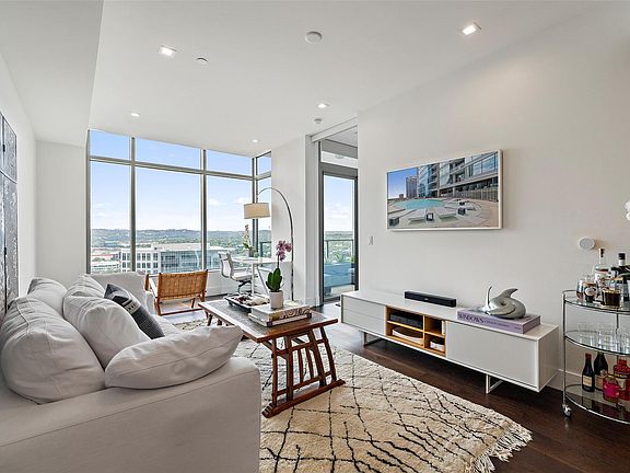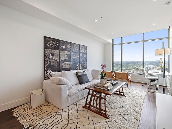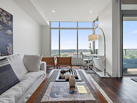 Welcome to Unit 2202 at the Fifth and West Residences in the heart of downtown Austin. Located on the 22nd floor, this luxurious condo offers unparalleled sophistication and breathtaking views overlooking West Austin and Lady Bird Lake.  Immerse yourself in the elegance of modern, urban living with floor-to-ceiling windows that flood the space with natural light, creating a warm and inviting ambiance. Stepping into the kitchen, you’ll find top-of-the-line stainless steel Miele appliances with double ovens, a built-in wine refrigerator, a five-burner gas cooktop and a countertop-depth refrigerator. The sleek and modern quartz topped waterfall edged island seamlessly blends functionality with style.  The primary suite is a true sanctuary, featuring a serene bedroom with picturesque windows and a spa-like bathroom, complete with marble flooring and premium fixtures & finishes. The oversized walk-in closet boasts custom built-ins for ample storage as well as an LG washer and dryer.  This unit also includes a stylish half bathroom, adorned with custom wallpaper, adding a unique touch of character and charm. Step outside on your spacious terrace, where you can take in the stunning views of West Austin while sipping your morning coffee or relaxing in the evening with a glass of wine.  This unit embraces effortless ownership with an included parking space and storage unit in addition to keyless entry, remote controlled window treatments and other smart home features. Residents have the privilege of utilizing the yoga studio, an event kitchen, a fitness studio, a grill and bar area, a pool with wet deck, cabana, and game room. For pet owners, there’s a dedicated dog park and pet spa.  The location extends beyond its doors with easy access to Austin’s best restaurants, shops, Whole Foods Market, Trader Joes, and multiple entertainment venues. Experience the epitome of luxury living in downtown Austin at Unit 2202 in the Fifth and West Residences!
