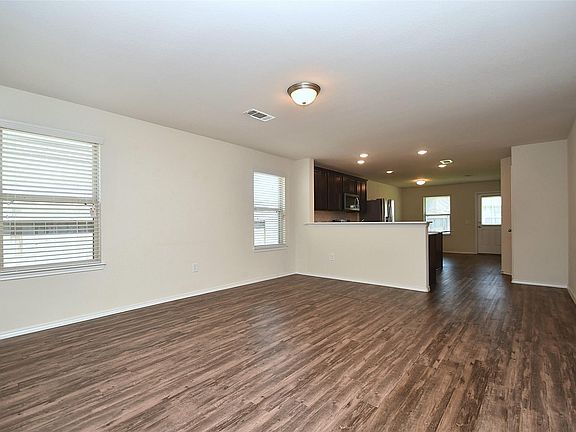 Stainless-steel appliancesGranite countertopWood looking vinyl floorOpen concept kitchenWhite cabinets