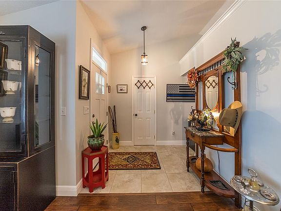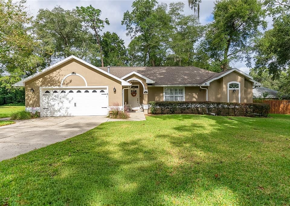 Welcome home to Hunters Trace! This beautifully maintained 3-bedroom, 2-bath home offers nearly 2,000 sq ft of comfortable living on a spacious landscaped .29 acre lot. Step inside to find a bright, open layout with vaulted ceilings, wood and tile flooring throughout (No carpet). Enjoy a generous family room with a cozy wood-burning fireplace to gather around—perfect for entertaining. The split-bedroom floor plan provides privacy, while the screened-in Florida room invites year-round relaxation. Recent updates include complete primary bathroom renovation and a new A/C system (2018) outdoor custom lighting with timer. Located in a quiet neighborhood with a low HOA fee, this home features an attached 2-car spacious garage can be controlled by an app for convenience. This location provides easy access to schools, shopping, and downtown Ocala. With southern front exposure, you’ll love the natural light all day long. Move-in ready and full of charm—schedule your private showing today!