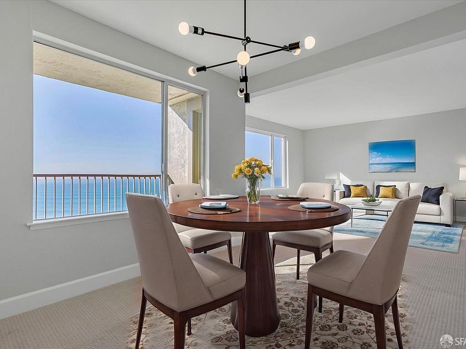 Exceptional ocean views from this beautiful corner end unit. Enormous living room with plenty of room to accommodate a large dining table and living room furniture, this allows for the flexibility of possibly using the formal dining room as an office or den. The adjoining deck showcases the stunning ocean views, and the refreshing coastal smells and the sounds of the waves crashing below. Large windows throughout fill the space with an abundance of natural light. Luxurious primary suite with lots of closet space. In-unit washer and dryer. It's a great unit for seniors and people with disabilities, as it's all one level and there are only a couple of stairs to access the unit from the street and the garage. One car deeded garage space with a spacious storage closet. Easy walk to coastal trails, Safeway, and Manor Plaza's shopping and dining. Great for commuters as there's easy access to Skyline Blvd, CA-1, I-280 to the City and Peninsula. HOA dues include water, garbage, insurance, earthquake insurance, exterior maintenance, Comcast basic cable TV, tennis court and Clubhouse.
