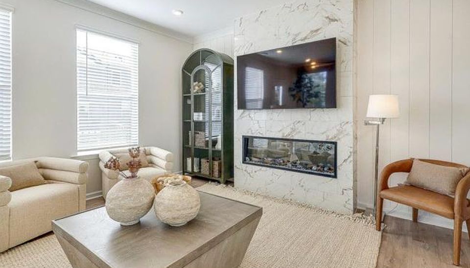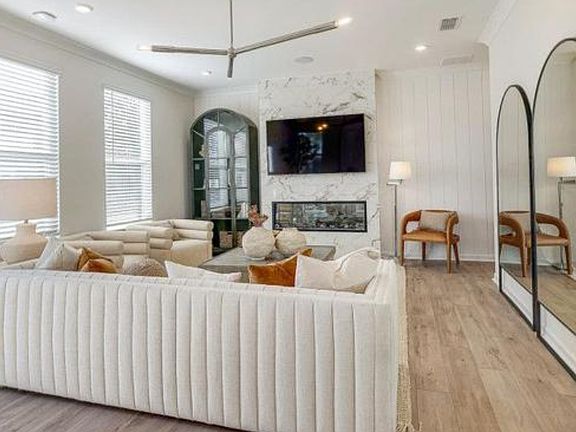 Linear electric fireplaceBeautiful kitchenTrey ceilingCenter islandMature treesKitchen aid appliancesLarge walk-in closet