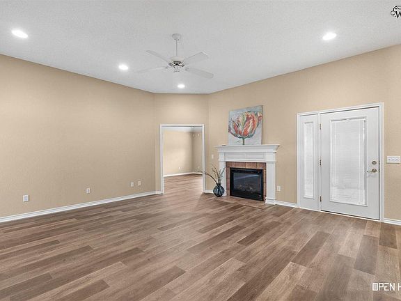 Spacious 3 beds, 2 baths, 2-car garage home features formal dining + breakfast nook, open living room w/gas fireplace, & family room w/built-in storage. Kitchen has granite counters, electric range, microwave, dishwasher, & pantry. Private primary suite includes patio access & en suite w/separate tub/shower, dual sinks, & dual closets—one serves as storm shelter. Secondary bedrooms share a hall bath w/shower/tub combo. Backyard oasis features lush landscaping, covered patio extending to pergola area.