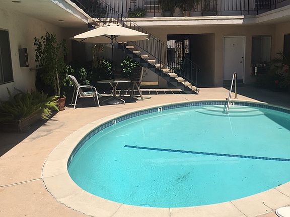 Super quiet upper, bachelor studio unit with hardwood floors, new cabinets, granite counters, tiled bath floors, new decor, private one car reserved parking, pool, laundry on site fully gated community. Owner pays for water & trash