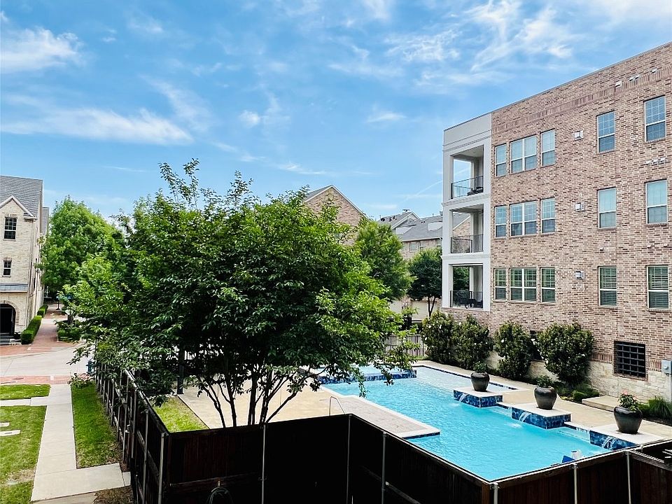 LUXURY ONE-STORY with POOL VIEW. LOCK & GO--HOA covers ext. insurance, pool, grounds, ELEVATOR, trash and water. Modern touches and custom features. Three Bedrooms and 3 full baths. One bedroom as study. Gourmet Island Kitchen--quartz counters, warming drawer or oven, SS appliances and gas range. Ease of entertaining--open kitchen. dining and living. Fabulous master suite with spa-like bath, sep. shower, and huge walk-in closet. Relax on the balcony overlooking the pool. En-suite bedroom bath remodeled 2020 with European-style frameless glass shower. Upgrades include wide plank Shaw engineered wood floors 2021, plantation shutters, black-out shades, retractable door screen, Lutron Caseta hub, and smart light switches. Elevator or stairs to first level. Walk to Dining and Events, Taste of Addison, Oktoberfest, Addison Concerts, and Kaboom Town! Parking includes 2 Assigned Spaces in the Underground Secured Garage. Sq. Ft includes the balcony.