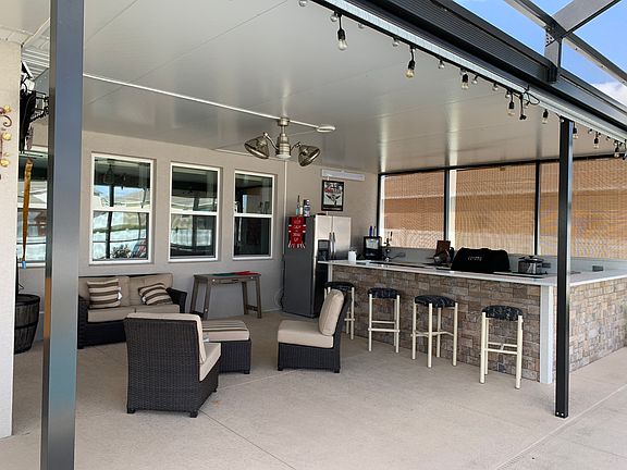 Salt water pool in a screened/covered lenai, summer kitchen that has a modern design