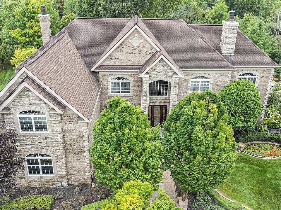 Spectacular all-brick and stone colonial located at the end of a beautiful cul-de-sac. This unique custom design is perfect for spacious everyday living and entertaining. A tree-lined path leads to an expansive covered porch with an elegant front door. Inside, a two-story foyer with marble floors and a winding staircase welcomes you. The kitchen opens into a magnificent family room with high ceilings, floor-to-ceiling windows, and a striking stone fireplace. Off the kitchen, a breakfast nook offers stunning views of the wetlands, pond, manicured backyard, and custom pool. A full bathroom on the first floor provides the option for a bedroom, while the sunroom, living room, and dining room complete the first floor. The second floor, accessible by a second staircase, features four spacious bedrooms, all with large walk-in closets, and three bathrooms. The primary bedroom boasts a tray ceiling and decorative woodwork. The twin bedrooms share a Jack-and-Jill bathroom, while the guest room includes its own bathroom and an oversized walk-in closet leading to a third-floor attic with 230 sq. ft. of storage. The walkout basement features continuous windows, a central bar, media and game centers, a craft room, gym, fifth bathroom, large storage space, and a two-car garage. Outside, a winding path leads to a custom inground pool, expansive paver deck, fireplace, and outdoor TV. A second patio with a covered section ensures enjoyment in any weather. Two staircases lead to a stone and brick two-story deck, showcasing the backyard oasis. The sound system covers both lower levels and the entire yard. Newer central air units, furnace, hot water tank, & driveway. Close to Downtown Northville, major freeways, Metro Airport, and award-winning Northville Schools, this home offers it all.