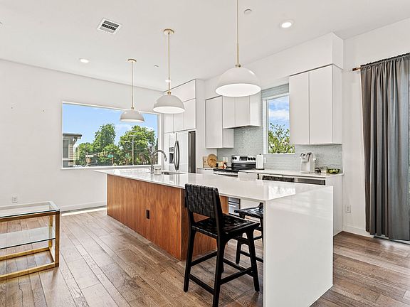 Sleek. Stylish. Steps from the Action. Live in the heart of it all in this show-stopping modern corner townhome, perfectly situated just one block from Lower Greenville Ave., Henderson Ave., and Garrett Park offering unbeatable access to some of Dallas's best dining, shopping, and nightlife. Plus, you're just minutes from the vibrant energy of Downtown Dallas, making work and play effortlessly accessible. This 2-bedroom, 2.5-bath residence delivers designer style, skyline views, and a lifestyle that blends luxury with walkable urban convenience. Step inside to a bright, open-concept layout filled with natural light from expansive windows. As a desirable corner unit, the home feels airy and private. The chef-inspired kitchen is a true centerpiece, featuring a massive center island, sleek cabinetry, premium appliances (including refrigerator, washer, and dryer), and unforgettable views of Downtown Dallas right from your kitchen window. The spacious living and dining areas flow beautifully for entertaining, while upstairs, both bedrooms are privately located on the third floor each with its own ensuite bath and ample closet space. Modern finishes, an oversized two-car garage, and included washer and dryer complete the package. Whether you're enjoying peaceful evenings in or exploring the city just outside your door, this home offers the perfect fusion of style, comfort, and location in one of Dallas's most desirable neighborhoods.