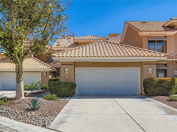 Live on one of the classic golf courses in all of Las Vegas. Enter through the front door & cast your eyes upon the tee box and fairway of Hole 5 of the Lakes Course @ Spanish Trail. The 18' ceilings create an open and bright living space. Porcelain wood-look tile floors thruout the downstairs add beauty and low maintenance. Your downstairs primary offers vaulted ceilings & views of the fairway from the private patio. Luxury extends into the bath w/ double sinks & walk-in shower as well as a walk-in closet w/ custom shelving. And if that is not enough, there is a space up the stairs in the reach-in closet for the future closet of your dreams. The eat-in kitchen boasts tons of cabinetry, granite counters, & stainless steel appliances. A den & a half bath round out the downstairs. Upstairs, you will find bedroom #2 w/ an ensuite bath. Enjoy the golf course view from your beautiful outdoor patios.