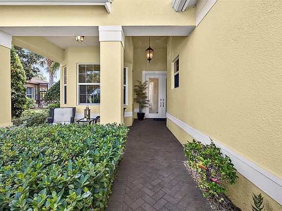 Builder’s Model – Loaded with Upgrades! Furniture Optional. Beautifully upgraded former builder’s model featuring an extended lanai and retaining wall with a landscaped seating area ideal for sunset viewing. Interior highlights include custom blinds, engineered wood flooring in main areas and office, tray and coffered ceilings with crown molding, and upgraded recessed lighting throughout. Gourmet kitchen offers Level 3 cabinetry with glass accents, quartz counters, under/over lighting, and upgraded GE appliances. Primary bath boasts full-height tiled shower with Listello accent, quartz counters, and upgraded cabinets with under-mount sinks. Additional features include epoxy garage floor, garage storage shelving, widened paver driveway and walkway, whole-house gutters, accordion storm shutters, glass entry door, 300 AMP electrical with surge protector, security lights, HVAC upgrade with variable-speed air handler, humidity control, and UV light, closet built-ins, hurricane-rated kitchen windows, and washer, dryer, and laundry sink included. Move-in ready and meticulously maintained! In Valencia Lakes your Yard maintenance, mowing and irrigation, cable TV, high-speed internet and security system are included in your HOA fees. You will have nothing left to do but move in and enjoy! Just a stone's throw to the renovated 40,000 sq. ft clubhouse and lifestyle center that includes: 3 separate pools (resort, resistance, and lap pool), outdoor hot tub; sauna and steam rooms in each locker room, bistro area (being renovated to bring in professional restaurant services), ball room, state of the art fitness center, tennis courts, pickle ball, bocce, softball, shuffleboard, basketball, recreation paths, RV and Boat storage lot on premises, clubs, crafts and much more! Also, a Veterans Memorial Park, called the Circle of Honor. Located close to shopping, restaurants, hospital and everything you need only minutes away.