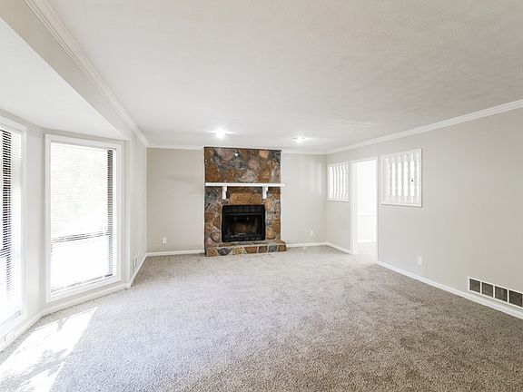 Step inside to a bright and welcoming living room, where a stone mantel fireplace serves as the stunning focal point. Bay windows fill the space with natural light, creating a warm and cozy atmosphere. The dining room features elegant bay windows, a chandelier, and wall trim details that add a touch of sophistication.
