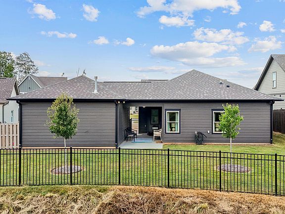 Step into this stunning 3-bedroom, 2-bath full-brick home, built in 2024 and designed with timeless style and modern upgrades. The painted brick exterior pairs beautifully with professional landscaping, an iron fence, and elegant up-lighting that enhances its curb appeal day and night. Inside, you’ll find an inviting open floor plan featuring an upgraded kitchen with premium finishes, perfect for entertaining. The dining room is a true showstopper with a barrel ceiling, while wood beams and stone fireplace add warmth and character throughout the living spaces. Additional updates include custom blinds and upgraded ceiling fans for comfort and convenience. Relax and unwind while enjoying breathtaking mountain views from your backyard oasis. This home combines luxury, charm, and functionality—all in a setting that feels like home from the moment you arrive.
