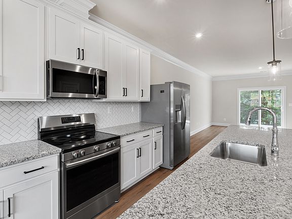 This 2025-built home features luxury vinyl plank (LVP) flooring throughout the open-concept living and galley kitchen areas. The kitchen is outfitted with quartz countertops and Frigidaire stainless steel appliances, including a French door refrigerator. The primary suite offers a spacious walk-in closet, while two additional bedrooms share a full hall bath. A flex fourth bedroom is located on the main level and can easily serve as a home office, study, or guest room. Additional highlights include a private rear deck, a washer and dryer conveniently located on the same level as the bedrooms, and two dedicated driveway parking spaces for the unit (this unit does not have a garage).