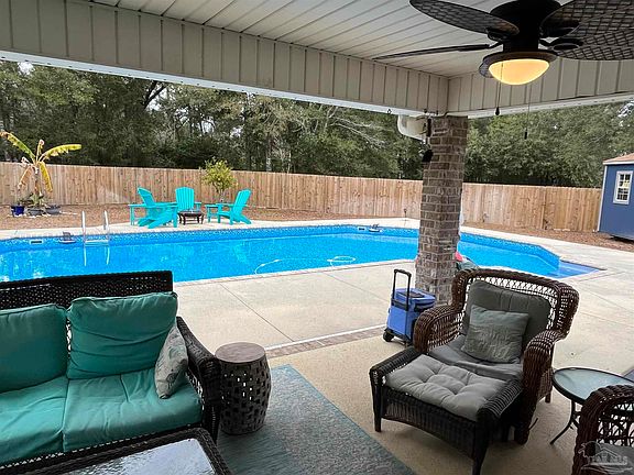 Welcome home to great neighborhood in an A rated schools district. This home is move in ready! All brick 4 bedroom/3 full bath/2 car garage with upgraded large POOL (built 2016) (new Liner 2022) home on a very large lot in the popular Brentwood Subdivision in Pace near Spencer Field. This home sits on a corner lot (new privacy fence 2023) in a cul-de-sac with back yard privacy and has a new roof (2021). When you walk into this gorgeous home you immediately notice the open arch into the formal dining room. The large remodeled open kitchen features center island (Butcher Block), QUARTZ solid surface counter tops, stainless steel appliances (Bosch dishwasher, smooth top stove with air fryer, built in microwave and side by side refrigerator), and a breakfast bar looking out into the living room and pool. Updated Kitchen cabinets with many bells and whistles done in 2020. Large pool (salt 2016, 8 feet deep). The living room has a wood burning fireplace and NEW AC (2020) looking out onto the covered porch. In addition to the formal dining room the home has a large 12X10 breakfast/eating area with windows overlooking the backyard and NEW SHED (2021, 8x20) with electric and work bench. The master bedroom features trey ceilings and additional storage. The master bathroom behind custom barn door features double vanity sinks, separate updated shower, large garden tub, and a large walk in oversized closet. One bedroom is located by itself on one side of the home with its own bathroom en suite. The other two bedrooms are located near the 2nd full bathroom and have large closets. The backyard features a covered porch and is fully fenced (new as of April 2023) with a wide double gate- room for a small boat behind the fence. The home has a sprinkler system for easy watering.
