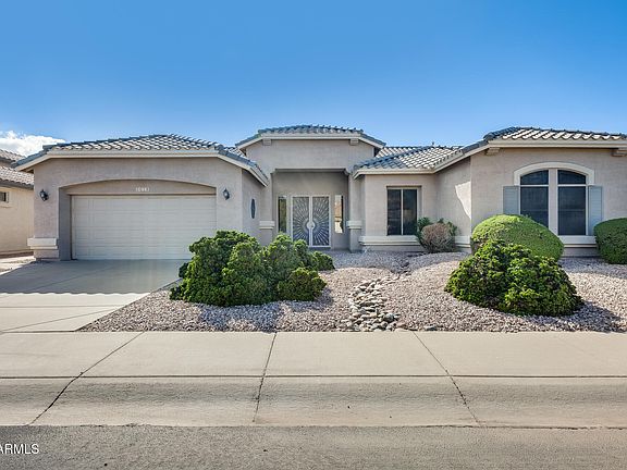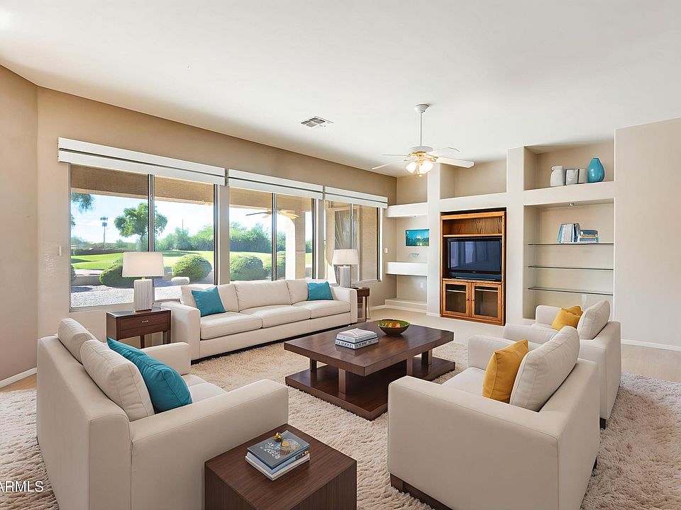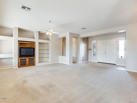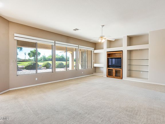 Golf Course Views & Resort Amenities! This bright home showcases soaring ceilings & abundant natural light throughout. The kitchen features a center island, pantry, eat-in dining area & large windows, flowing seamlessly into the living room with built-in shelving & carpeted floors. The spacious primary suite offers French doors, backyard access, high ceilings, walk-in closet & an ensuite with dual vanity, walk-in shower & soaking tub. Two additional bedrooms are generously sized, ideal for guests or a home office. Enjoy a covered patio overlooking the golf course & mountain views! Added perks include a 2018 AC unit, new dishwasher, built-in garage cabinets & garage fridge. Community amenities include a clubhouse, two pools, spa, fitness center & courts for tennis, pickleball & bocce ball.