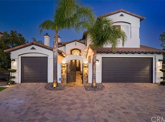 Beautiful, Elegant Home high on the hill in the desirable Reserve area of Rancho Cucamonga. This stunning home offers a decorative stone paved driveway, extensive landscaping, lighting & many more high quality upgrades inside & out, including PAID FOR SOLAR. The front entry gate opens to a stone tiled path leading to a cozy private courtyard & fireplace, gorgeous metal front doors, welcome you to this magnificent home. The 3rd car garage is a beautifully finished PRIVATE SPA SANCTUARY, could also be a Gym, Theater Room, Man Cave, She Shed. The formal living room has a fireplace, plantation shutters, sconce lighting & barn doors open to the family room for a massive entertaining area, or closed for a private living room. The family room is open to the stylish newly remodeled kitchen, w/views of the resort style entertaining backyard thru multiple doors & windows.You will LOVE the kitchen w/ new Kraftmaid cabinets, quartz counters & stainless appliances, dbl oven, cook top w/customized professional hood, & 2 pantry areas.Open loft, possible 5th bedroom. The master bedroom offers a beautiful adorned ceiling, flooring & city light views from the balcony.The master bath is a remodeled spa bathroom w/dark cabinetry, quartz counters, huge spa shower & relaxing tub.Features are crown molding, beautiful herringbone flooring, water filtration, 3 barn doors, security cameras. Spacious entertaining backyard w/patio, Salt water, pebble tec pool & spa w/rock waterfall, & fire pit.