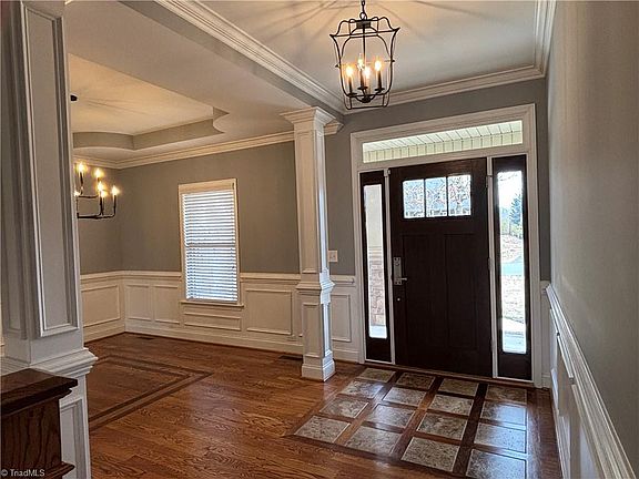 Excellent Clemmons location, nicely updated. Large main level primary, plus three more bedrooms and bonus room up. Convenient screen porch and deck (quality trex flooring) with nice outdoor views. Numerous quality trim features inside, plus encapsulated crawl space and full iron fencing. Good size room between garage and kitchen for costs etc.