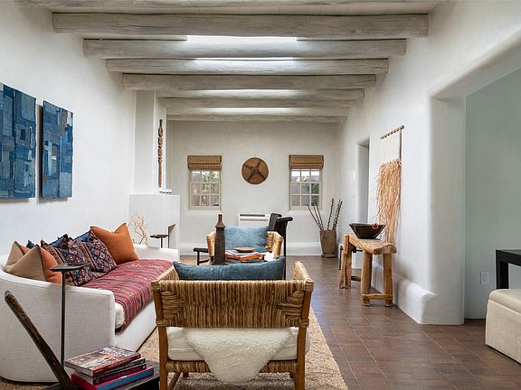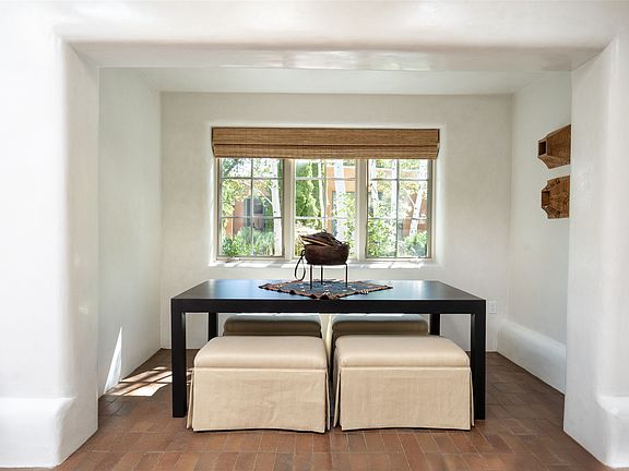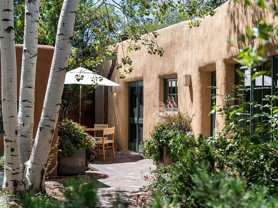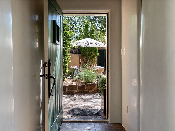 Recently renovated Pueblo-style compound that captures the spirit of Santa Fe in the heart of the coveted Historic Eastside. As you enter this enchanting property, you are greeted by a beautifully landscaped courtyard, a tranquil escape with multiple seating areas, perfect for indulging in quiet moments or lively gatherings. The property exudes old-world charm, featuring five wood-burning fireplaces, traditional vigas and beams, and a delightful mix of brick, tile, and wood floors that create a warm and welcoming atmosphere. The 1,521 sq. ft. main house offers 2 spacious bedrooms and 2.5 elegantly appointed baths. 2 dedicated parking spots lead to a private entrance. The thoughtfully remodeled interior showcases a redesigned kitchen that is both functional and exquisite, featuring custom cabinetry and high-end appliances. New primary suite is adorned with reclaimed terracotta Giallo-style tile, a chic wet bar, and a sophisticated Domingue waterproof plaster bath. Additionally, there is a rare finished 554 sq. ft. basement. Complementing the main residence is a charming 1,216 sq. ft. guesthouse. This newly renovated space features two parking spots and a gated entrance. With its open-concept design and skylights, the guesthouse is bathed in natural light, creating a bright and airy ambiance. Ideally located, just moments away from Downtown Subscription, a local coffee house and gathering spot, as well as Canyon Road, Kakawa Chocolate, and Kaune’s Neighborhood Market
