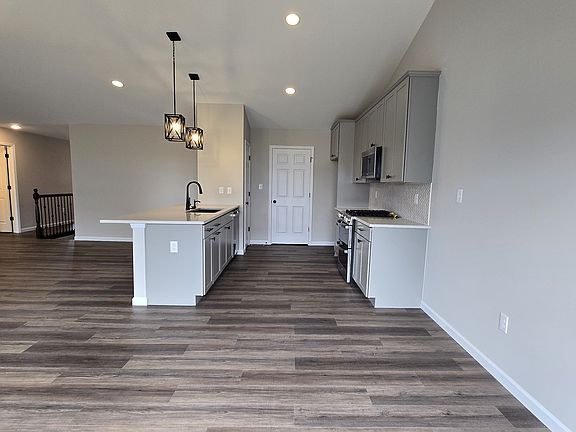 The chef-inspired kitchen is a true showstopper, featuring an oversized island with breakfast bar seating, elegant Level 4 white 42" cabinetry, gleaming quartz countertops, stainless steel GE appliances, and a spacious walk-in pantry. Host dinners with ease in the bright dining area, complete with a sliding glass door leading out to the future covered deck perfect for enjoying the outdoors.