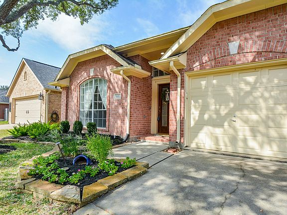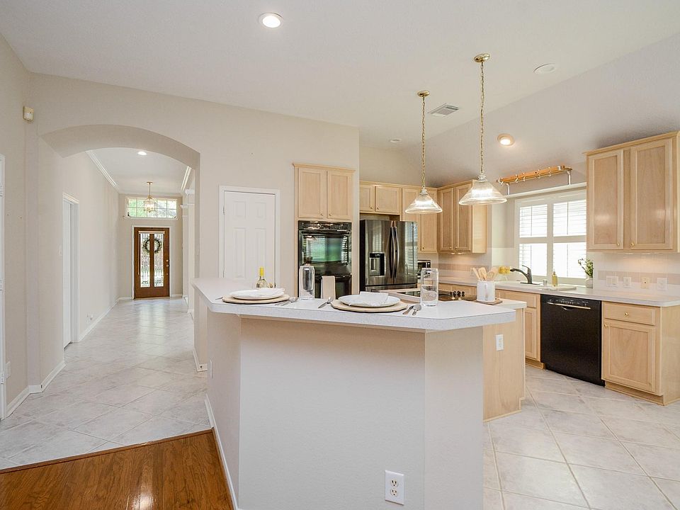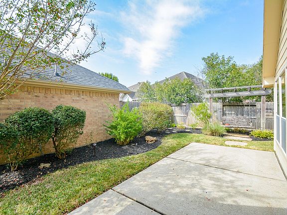 Neat & Clean 1-story patio home was built by David Weekley Homes in Stonehaven subdivision in master planned community of New Territory w/great community amenities. Light/bright home w/many high ceilings, large windows, plus many plantation shutters. Corner lot. Covered front porch. Formal living/dining w/large arched windows. Wood floors in family room w/fireplace, high ceilings & built-ins. Kitchen w/electric cooktop at island (also has gas line at island), double ovens, Bosch dishwasher, lots of countertop space. Window seat in breakfast area. Kitchen/breakfast open to family room. Primary retreat is located in back part of home w/large windows that look out to side yard/patio. Primary bathroom with some updates, dual sinks, separate shower, jetted tub, large walk-in closet. Concrete patio. Backyard & side yards. Yard sprinkler system. Root barrier. Roof shingles approx. 9 years old. AC replaced Sept 2025. Easy access to 90 & Hwy 6! Low tax rate! A MUST see!