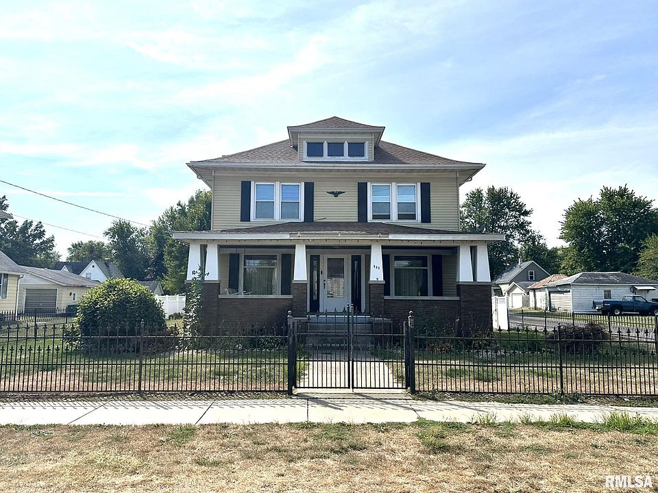 This iconic and stately 3-bedroom, 1-bath residence showcases timeless craftsmanship and thoughtful care at every turn. Beautiful hardwood floors, elegant crown molding, and original woodwork flow throughout, highlighted by a striking stained-glass window. The kitchen preserves classic character with an inviting breakfast nook, a convenient island, and upgraded appliances including a dishwasher. Just off the kitchen, the formal dining room features a stunning built- in sideboard with leaded-glass doors perfect for hosting and entertaining. A graceful open staircase leads to the second floor where more natural hardwood floors await. The third floor offers original tongue-and-groove flooring and a spacious, versatile area ready to become a home office, studio, game room, or additional bedroom, whatever you dream of. Enjoy evenings on the large front porch complete with porch swing. Decorative wrought-iron fence defines the front yard, while a six-foot vinyl privacy fence encloses the back, providing curb appeal, security, and peace of mind for children and pets. Additional highlights include: Detached garage with covered patio space and natural gas hookups (garage soffit needed), new roof, water heater, and boiler within the last five years, and radiator heat for steady, comfortable warmth throughout the colder months. Don’t miss the opportunity to own this home where historic charm and modern comforts meet, must see in person!