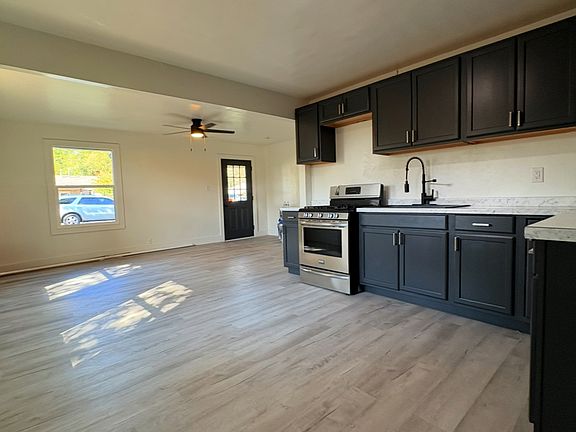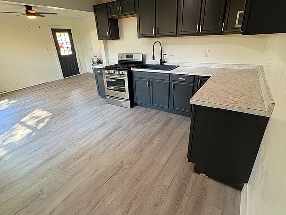 Outside, enjoy a large fenced backyard with plenty of room for entertaining, pets, or a garden. The fresh exterior paint, black trim accents, and covered front porch give this home great curb appeal. A gravel pad in the backyard provides space for seating, entertainment, or grilling.
