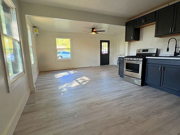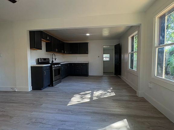 Step into the open-concept living and kitchen area featuring brand new luxury vinyl plank flooring, fresh paint throughout, and plenty of natural light from the large windows. The kitchen is newly renovated with sleek black cabinetry, stainless steel appliances, and updated countertops, making it both stylish and functional.