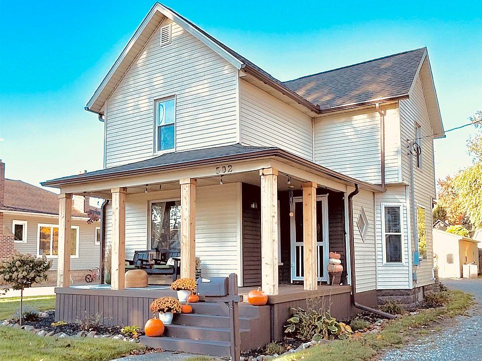 Charming Blissfield home on a double lot—right on the parade route! Enjoy front-row seats to every community event from your cozy front porch. Professionally designed remodel with spacious living/dining area, hardwood floors, and a kitchen ceiling crafted from a 100-year-old barn door reclaimed from a local farm. Numerous updates: dual-zone furnace & A/C (2017), new roof on house (2019) and barn (2017), hot water heater (2020), refrigerator (2020), and spray foam insulation (2020). Heated 30x40 pole barn in town with half bath, workshop, and space for two cars. Large driveway, fire pit, hot tub, and gazebo—perfect for entertaining! Easy walk to school and downtown.