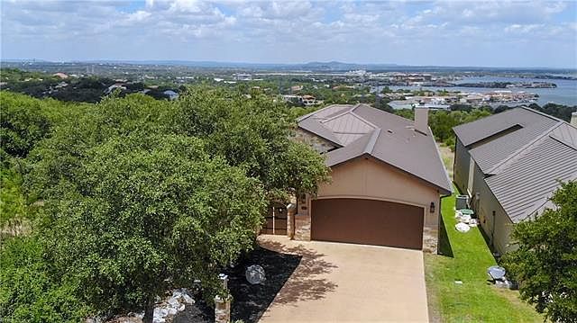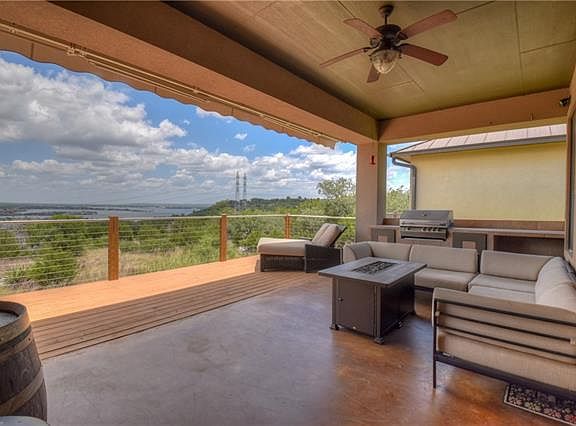 Panoramic views of Lake LBJ abound in this single story, 3 bed, 2 1/2 bath home. Spanish colonial gate entry to front courtyard. Magnificent details: coffered 10+ ft. ceilings, knotty alder cabinets, granite counters, NEST thermostat, farmhouse sink, stained concrete, and wood tile floors. Kitchen, living and dining room all open to enjoy the views. Expansive Master bedroom. The walk-in closet is spectacular! Large patio with built-in BBQ, retractable awning... with spectacular lake views!
