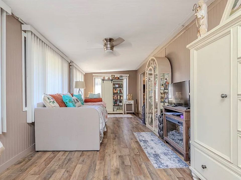 Welcome to your new home in The Oaks, one of DeLand's most desirable active 55+ communities! This 1990 Homes of Merit features a spacious 2-bedroom, 2-bathroom residence offers comfort, convenience, and a welcoming lifestyle surrounded by beautiful oak trees and peaceful streets. Interior Features: Generously sized living and dining areas with plenty of extra space-perfect for a home office, hobby room, or entertaining guests. A bright and fully equipped kitchen with a designated dining area just steps away. New A/C system installed in 2023 for year-round comfort. Water heater replaced in 2020, offering added peace of mind. Community & Lot Details- Lot rent: $878/month and Includes: Overnight security, year-round lawn care & irrigation water (non-potable), high speed Fiber optic internet, 125 + DirectTV streaming channels and access to all The Oaks amenities - including clubhouse, pool & Jacuzzi, fitness center, tennis courts. Friendly and peaceful 55+ community with over 2 miles of shaded streets, perfect for walking or bike rides. Located just minutes from shopping, dining, and downtown DeLand, this home combines low-maintenance living with an active lifestyle.