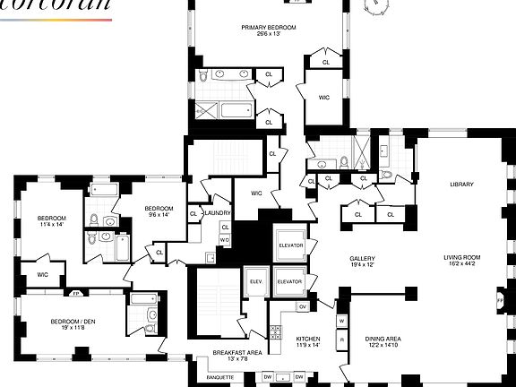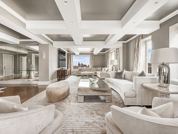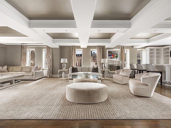 A private elevator opens directly into an elegant entrance gallery, leading to a 45-foot-wide living room with a gas fireplace, adjoining wet bar, and formal dining roomeach framed by sweeping vistas of Park Avenue. The adjoining top-of-the-line, windowed chef's kitchen features premium appliances, a separate breakfast nook, and a custom built-in banquette, perfect for casual dining.