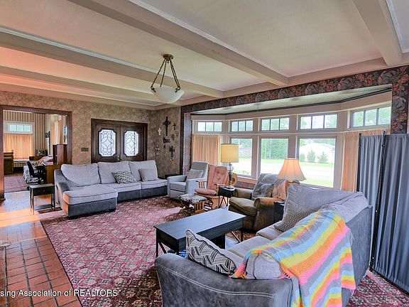 You've driven by it for years-now is your chance to own this iconic 1927 5-bedroom, 2-full+2-half bath brick beauty in the heart of Eaton Rapids. This historic home is full of charm and craftsmanship, featuring stunning woodwork, a grand staircase, built-ins, 1st floor laundry and a tank-less water heater. The spacious living room boasts beamed ceilings, large bay window and a fireplace. The kitchen includes a 6-burner gas stove, eat-in space and adjacent breakfast nook. The brick-floored 3-seasons room is a serene space for unwinding or creating a vibrant plant haven. The finished 3rd story, full basement, attached garages plus a 2+car detached garage provide endless possibilities for hobbies & storage. This admired home, rich with history and heart, is ready for you to make it your own