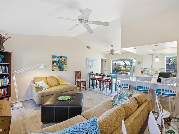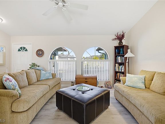 Fabulous pool home has been totally remodeled with over $50,000 spent on new floors, paint, roof, pool cage, pool pump ( list of warranties in house).  Located on main canal leads to Lake Kennedy and 7 other lakes.  Connects to city boat launch.  Tiki hut always has a fabulous breeze.  Cathedral ceilings in both family room and living room.  4 sets of sliders to heated pool/ spa combo.  Cage was replaced just before Ian in April 2022!  Walls removed and open to living room with quartz countertops and blown glass pendants, under cabinet lighting, and white cabinet doors.  double sinks in M bath features marble - European style hangs on wall.  roof + air conditioning new in 2023  SS kitchen appliances, too.  MBR walk in closet is 13' long (all 3 bedrooms have walk in)  great party house!
