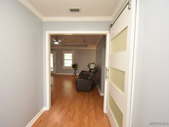 Split floorplan vaulted dining room, coffered ceilings in grand room and master bedroom. Grand room features Gas log fireplace and tankless hot water heater. Gorgeous custom vaulted front porch with beautiful beams Plantation blinds through out, Custom barn door in foyer with rain glass