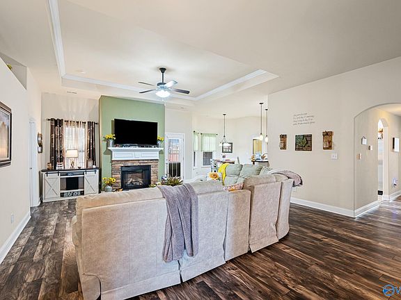 - Features: Ceiling Fan(s), Crown Molding, Fireplace, Tray Ceiling(s), Window Cov, Wood Floor