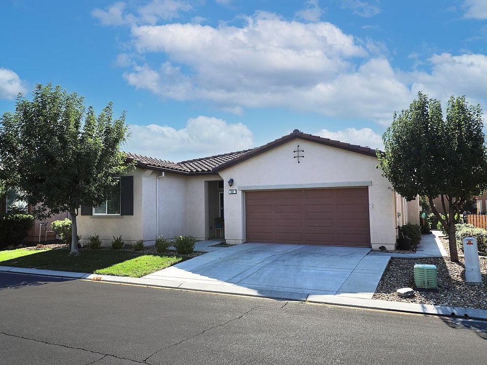 This beautiful Belmont model has been tastefully upgraded throughout. New luxury vinyl plank flooring in majority of home, brand new carpet in both bedrooms. Extended intimate patio overhang with side privacy screen makes for a lovely year around protected eating/relaxing area completed with a gorgeous array of roses. The yard is fully fenced and has low maintenance landscaping. Gorgeous kitchen quartz counters, stainless appliances including a Bosch 5 burner gas range, pull out cabinetry and custom pendant lights are just a few of the many kitchen extras this home enjoys. Lighting and ceiling fans have been upgraded throughout the home. Both bathrooms have been fully upgraded. Whole house water filtration system with R/O in kitchen, surround sound system in family room, gas fireplace and pre-paid solar lease for 7 more years. Custom shelving in garage included. This is a 55+ community, and HOA fees do not include golf play.