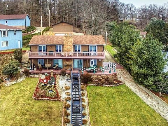 Lakefront Beauty situated on a point w/ 126 of lake frontage and elevated panoramic views of the lake. This spacious 4 bedroom, possible 5 bedroom home has everything you could want including a two story four car garage. Second master suite with a fireplace could also be used as another family room or a bunk room with a beautiful full bath with a walk in cedar closet. The living room has a frpl. w/insert and sliding doors to a huge stamped concrete patio. Perfect for entertaining and grilling! Dining area has a full wall with cherry built-in shelves and cabinets. The den also has built in cabinetry of wormy chestnut, plus a trundle/day bed making it functionally a 5th bedroom. The upstairs game room provides a second large entertaining area in addition to the main floor great room. Enjoy sunbathing and the gorgeous views from the full deck made from composite wood. LED accent lighting around the deck and down the composite steps add a nice atmosphere! No deferred maintenance or capitol improvements left hanging! Everything has been done here 1st class; there's nothing left to do but enjoy the lake! Newer furnace, air conditioner, aluminum docks, sea wall, stamped patio, game room, hot water tank, stove, refrigerator, retaining wall and new roof just completed. There's plenty of room for entertaining and overnight guests! Don't miss this one! Furniture, golf cart and pontoon boat are all negotiable.