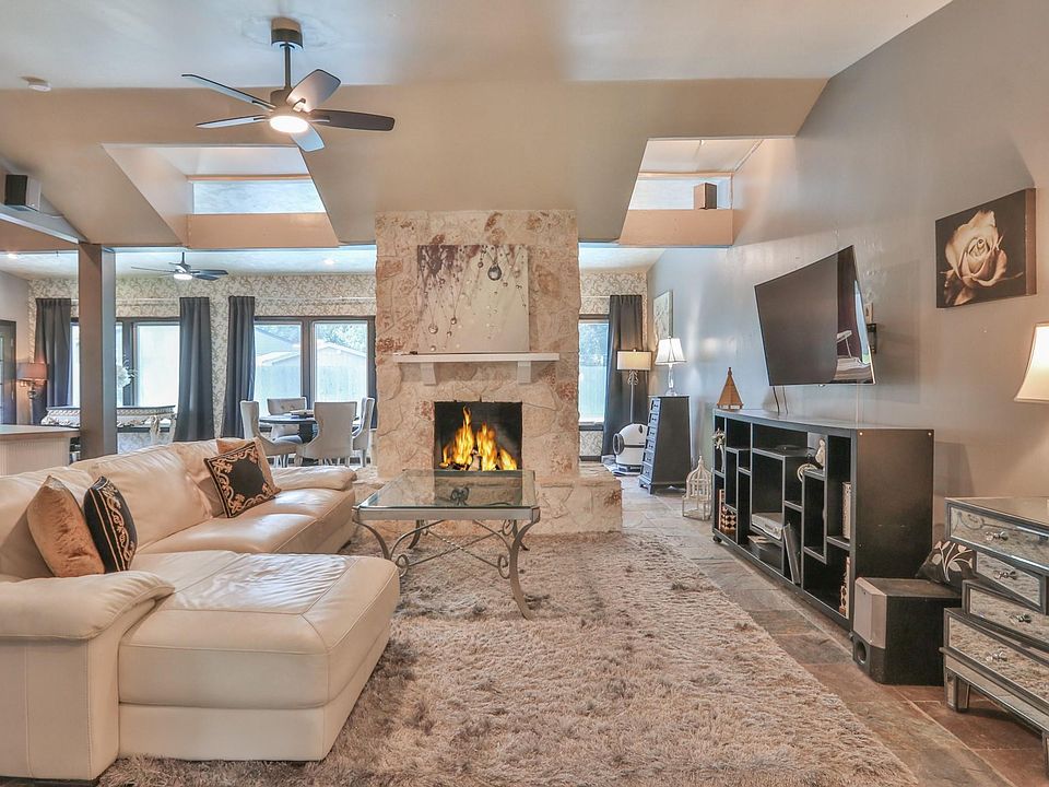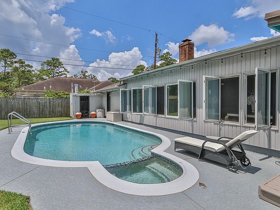 Welcome to this beautiful single-family home in a quiet neighborhood, surrounded by palm trees and a sparkling pool. Featuring copper Quartzite slate tile flooring, a natural stone fireplace, and a spacious kitchen with stainless appliances and abalone backsplash. The home offers 2 bedrooms and an office space, with the option to convert back to 3 bedrooms. Relax with your morning coffee or unwind with a glass of wine on the covered patio overlooking the pool, which was recently resurfaced with new decking, (2022) along with the roof and A/C.(2019) and a new breaker box and wiring. (2022) Refrigerator remains with this home. Conveniently located near NASA, I-45, and Kemah. This 1975-built property is a must-see at 502 Wildwood, offering 1882 sq ft on a 9060 sq ft lot.
