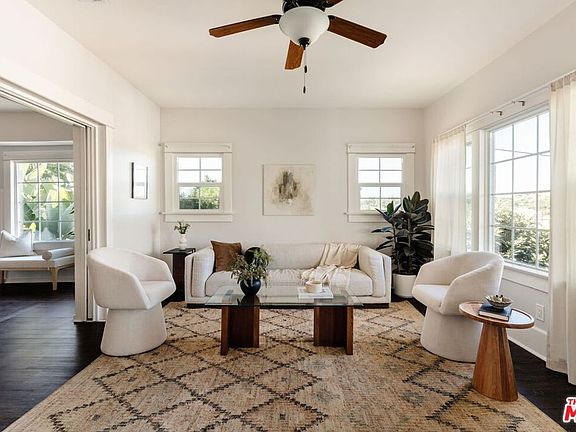 Private and gated, this charming El Sereno residence in University Hills offers warmth, character, and sweeping city and mountain views. The property features a 2 bed, 1.5 bath main home plus a separate lower-level studio with its own entrance, perfect for guests, extended family, or creative pursuits. Through the front gate, a welcoming porch and spacious patio set the tone for easy California living, ideal for morning coffee, relaxed evenings, or friendly gatherings. Inside, the bright and airy living room is filled with natural light and flows effortlessly into a generous dining area, creating the perfect setting for entertaining. The kitchen stands out with its green cabinetry, tiled countertops, and a cozy breakfast nook. A conveniently placed powder room and laundry area sit just off the kitchen, adding everyday practicality. Down the hall, two comfortable bedrooms offer ample closet space and share a centrally located bathroom with vintage charm. The lower level hosts a fully independent studio space, featuring a private side entrance, kitchenette, bathroom, and laundry area. With new flooring, updated countertops, and modern lighting, this flexible space can serve as a guest suite or personal workspace. Out back, the yard is a true retreat with fruit trees, a raised garden bed, a firepit, and a pergola perfect for dining al fresco. Two storage sheds and a one-car driveway provide added function to this inviting property. Located near Ernest E. Debs Park and Ascot Hills Park for hiking and nature walks, and just minutes from local favorites like Holy Grounds Coffee, Evil Cooks, and Lil' East Coffee, this El Sereno gem offers peaceful living with easy access to the best of the neighborhood.