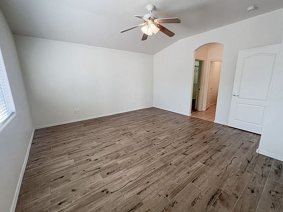 Single-level 2 bedroom, 2 bathroom home with an open floor plan, featuring ceiling fans in the main living area and master bedroom. The house boasts wood plank tile flooring throughout. Located in the gated community of Amante at Verde Santa Fe, residents enjoy access to a community pool, fitness room, and clubhouse. The master bedroom includes a large walk-in closet, an ensuite bathroom with dual sinks, and a step-in shower. The guest bathroom offers a tub/shower combo. The property also has a covered back patio, mountain views, and an attached 2-car garage. AC/Heat. Utilities for gas, electricity, and water are tenant's responsibility, while the owner covers sewer and HOA fees. Renter's insurance is required. Pet Negotiable.