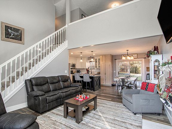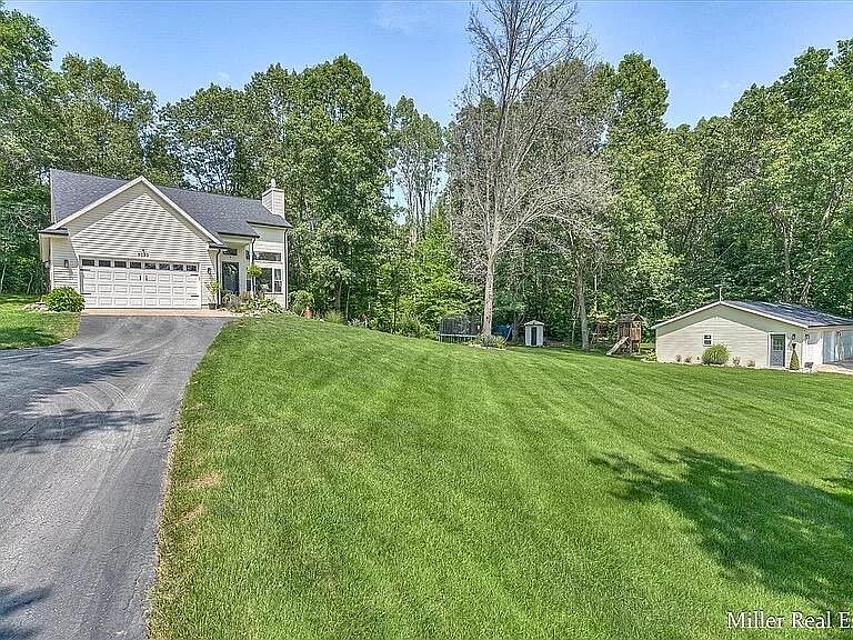 Nestled in a peaceful wooded setting between Hastings and Middleville, this stunning home offers the perfect blend of comfort and country charm. Featuring 4 bedrooms and 3.5 baths, including a main-floor primary suite with laundry, this property is designed for convenience. The updated kitchen with quartz countertops opens to the dining and living areas with a cozy fireplace and open layout. Upstairs, a versatile sitting area is ideal for an office or playroom. Enjoy entertaining in the finished walkout basement with bar, or outdoors on the deck and patio overlooking the landscaped yard with underground sprinklers. The heated, insulated 32x46 garage provides extra space for vehicles, storage, or hobbies. New roof and gutters on home and outbuilding in 2023. Located across from 1,000+ acres of State land in a charming neighborhood with a true country feel!
