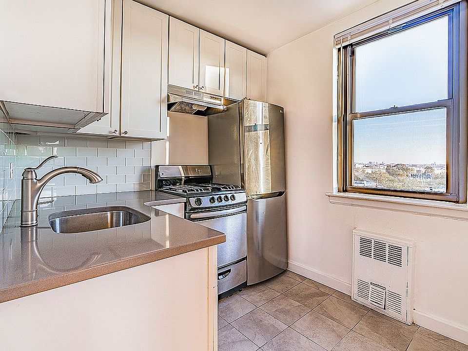 This Sponsor unit is spacious 700sq ft 1 bedroom unit has been newly renovated and is located on the 4th floor of an elevator building in the very quiet neighborhood of Sunnyside. The unit is a corner unit offering tons of sunlight and stunning views of the Manhattan skyline & Kosciuszko Br. It features a beautifully renovated kitchen with stainless steel appliances, plenty of cabinets and quartz counter-tops. There is pristine wood flooring throughout, a large 11x17 corner bedroom that is large enough to fit a California king, tons of closet space, a gorgeous newly tiled bath with sliding glass doors. The living room has unobstructed skyline views, bright West and South exposure. The living room is approximately 12x20 and large enough to fit a sectional, desk and kitchen table. There are four closets offering ample storage and six windows allowing for tons of sunlight. Heat, hot water and cooking gas are included in the maintenance which is $886.04. Cats Only. Sorry no dogs.