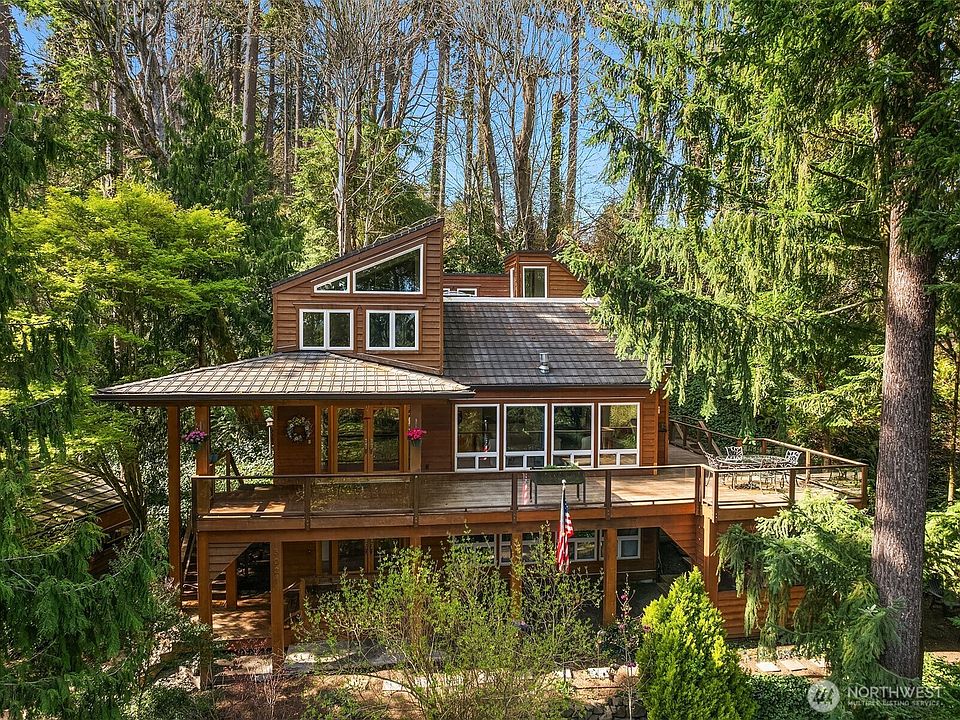 This one-of-a-kind property is a masterpiece of craftsmanship, thoughtfully designed to create a sense of timeless beauty. With a unique blend of natural woods that add warmth and character, the property has a serene setting for privacy and is perched high for views to Lake WA. Towering windows flood the home with natural light. The handsome birch floors lead you throughout the airy, open main level. Grand and impressive, the sleek kitchen is the heart of the home. Upstairs, the primary suite connects to a loft and sunroom - a wonderful design for activities like work-from-home, crafts, reading, yoga. With multiple view decks, there is no shortage of outdoor spaces to enjoy the natural surroundings. Well loved & beautifully maintained.