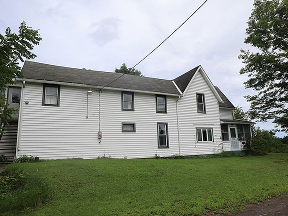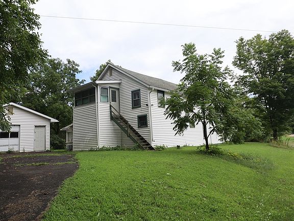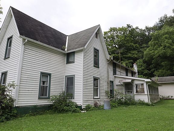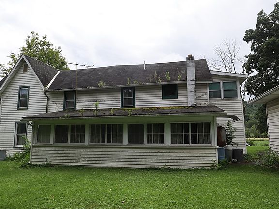 PRIME LOCATION for this property which includes 16.6 acres of partially flat, partially wooded land, just off I86! The home is being sold AS-IS has good bones, and once included 2 living spaces, one on first floor and one on second floor. Vinyl siding and 2-car garage are newer, with electronic opener. Seller has no information as to the condition of the furnace, plumbing, or electric, well or septic.