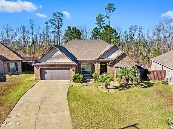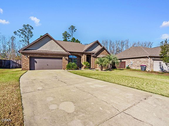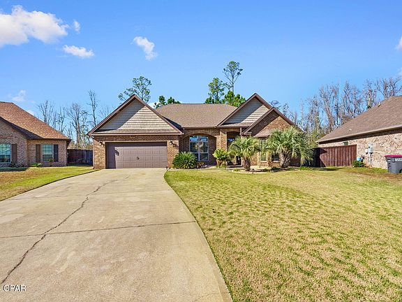 CURRENTLY UNDER CONTRACT, SELLER WILL CONSIDER BACKUP OFFERS. This stunning brick home is packed with charm and features! Boasting 3 bedrooms, 2 bathrooms, and a spacious office with elegant double French doors, it's designed for both comfort and functionality. Step into the open-concept floor plan adorned with plantation blinds throughout, crown molding, and wood floors in the main living areas. You'll love the arched entryways, double tray ceiling in the great room, and the blend of beautiful tile and granite in the kitchen and bathrooms. Plus, there's brand-new carpet in all the bedrooms! The master suite is a true retreat with a sitting area drenched in natural light, private access to the screened-in patio, and a luxurious bath featuring a garden tub, tiled shower, and double vanity. Outside, the spacious, fully fenced backyard is perfect for relaxing or entertaining, and the home is equipped with security cameras for added peace of mind. Located in a highly sought-after neighborhood, this gem is within walking distance to Tommy Smith Elementary and Merritt Brown Middle Schools and offers quick access to Hwy 231 and Star Ave, making it ideal for Tyndall AFB personnel or shopping enthusiasts. Don't let this incredible opportunity slip away—schedule your showing today!