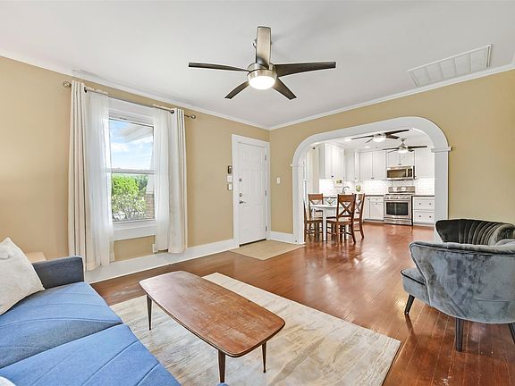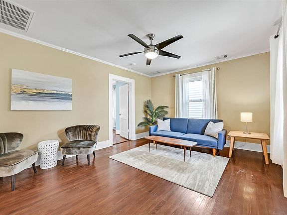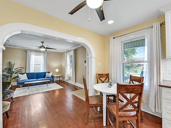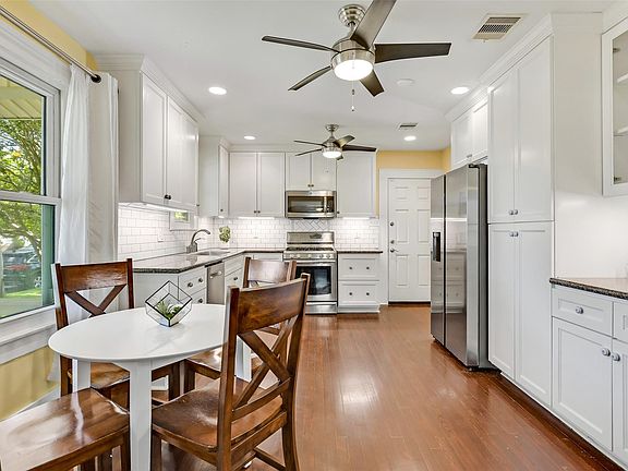 Charming craftsman-style Galveston home with great updates and character! This 3–4 bedroom, 2-bath home offers 1,370 SF of living space with refinished original hardwood floors, fresh paint, ornate moldings, central HVAC, and newly installed hurricane-rated windows. The remodeled open-concept kitchen features granite counters, a timeless subway tile backsplash, recessed lighting, solid wood custom cabinetry with under-cabinet task lighting, and modern stainless steel appliances. The primary suite connects to a versatile bonus room—ideal as an office, nursery, second living area, or a 4th bedroom, complete with a closet. Also note the indoor utility room with a sink, washer & dryer included! Enjoy the fully fenced backyard with mature landscaping and a storage shed. Located in a desirable midtown neighborhood just 0.9 miles from the beach and close to great restaurants and shopping. This well-maintained home has NEVER FLOODED and blends modern upgrades with classic Galveston charm!