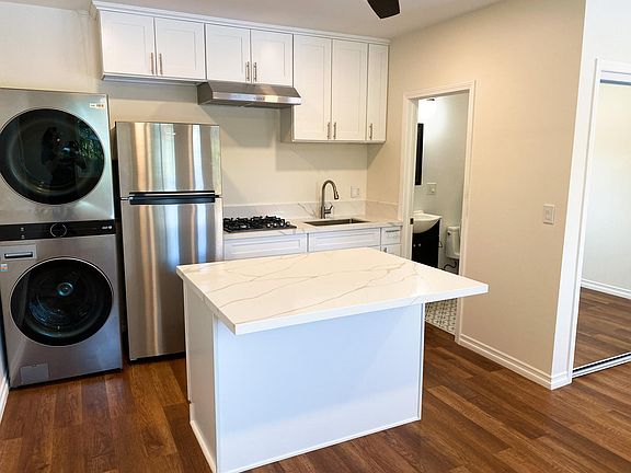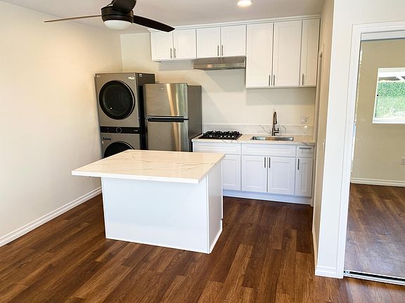 Updated studio (pool back-house) in the most desirable part of Lakewood! Enter through the side gate into the peaceful shared backyard, complete with a gorgeous oversized swimming pool. This unit has no shared walls! Enjoy the luxury of doing laundry in-unit with the full-sized LG ThinQ Washer and Dryer. The kitchen boasts a gas stove top, fridge, closet, and a beautiful quartz countertop island with overhang space for barstools. Gorgeous tiled bathroom with walk-in shower. Plenty of room in this open layout for your living room and bedroom furniture. Create a space to call home. This unit also boasts a remote controlled Mini-Split AC/Heat, recessed lighting, and overhead fan. Large, mirrored closet adds to the natural light from the large windows, overlooking the shared yard. Enjoy the peaceful backyard space with an oversized swimming pool and beautiful plants like lavender, palm trees, and California poppies. Street parking only (street parking is readily available in this neighborhood). Quiet and calm family neighborhood. Non-smoking unit. Must respect shared outdoor space with neighbors. No pets.