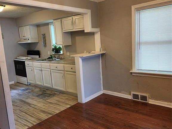 This brick bungalow sits on a hill on a quiet street surrounded by trees. Updated in 2022, it has new windows, flooring, and fresh paint. All electric appliances include stove, refrigerator, washer and dryer. It has a central air unit, circuit breakers, and a working furnace and hot water heater. The backyard is fenced in and there is a two-car parking pad in the back. This beauty is move-in ready.