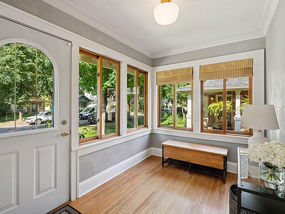 This elegant 1.5-story bungalow in Fulton offers an inviting front porch, a wood-burning fireplace, and polished hardwood floors throughout. The sunlit kitchen has been renovated with brand new appliances, counters, and cabinetry. Featuring a wall of glass patio doors leading to the deck, bluestone patio, and a landscaped backyard with new sod enclosed by a privacy wood fence. The main floor also features a formal dining room that opens to the living room, two bedrooms and connecting sunroom. The entire upper level features the primary suite, which includes a renovated luxury bathroom appointed with a white quartz vanity, reclaimed wood backsplash, gray cabinetry, a subway-tiled shower, and distinctive architectural ceiling designs. Refinished lower level with high ceilings and a cozy family room. New furnace, A/C, roof, washing machine and sewer liner. Lots of storage throughout and a 2+ car garage. Desirable Fulton neighborhood that is just south of Lake Harriet with walkability to restaurants, trails, parks.